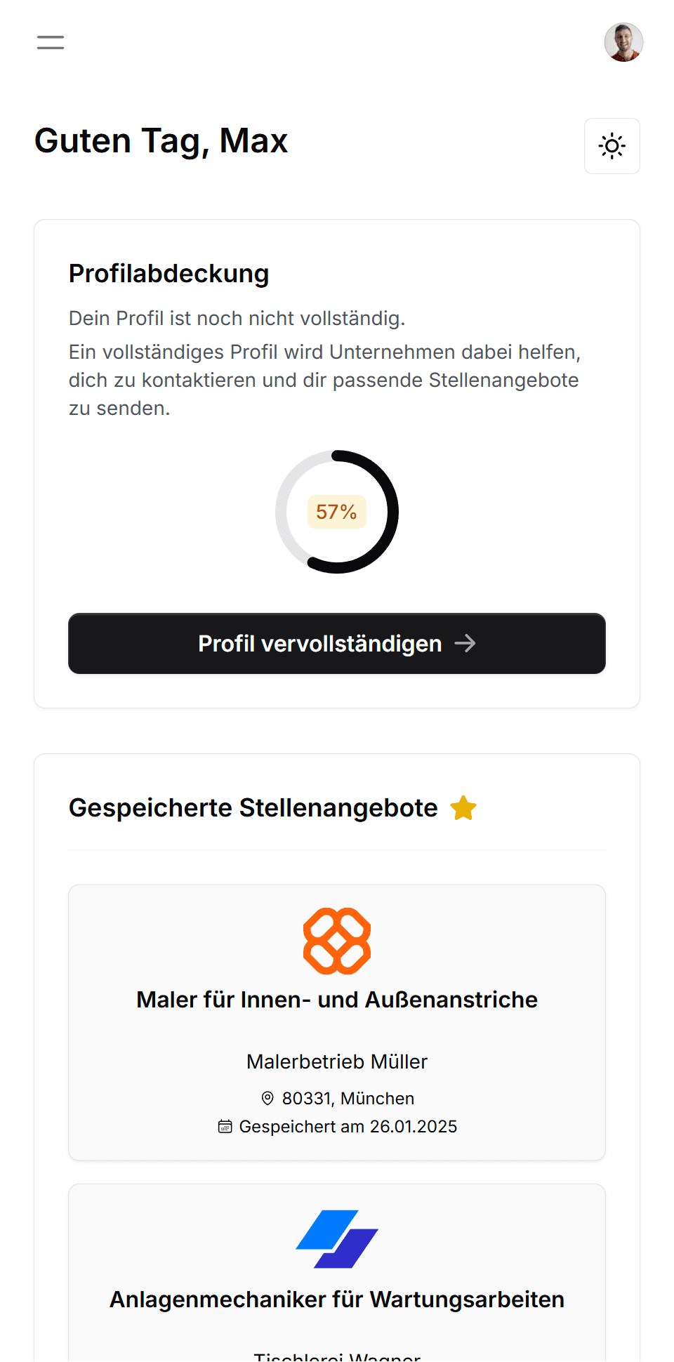 Dein Profil bleibt anonym, bis ein Betrieb echtes Interesse zeigt. Du behältst die volle Kontrolle!